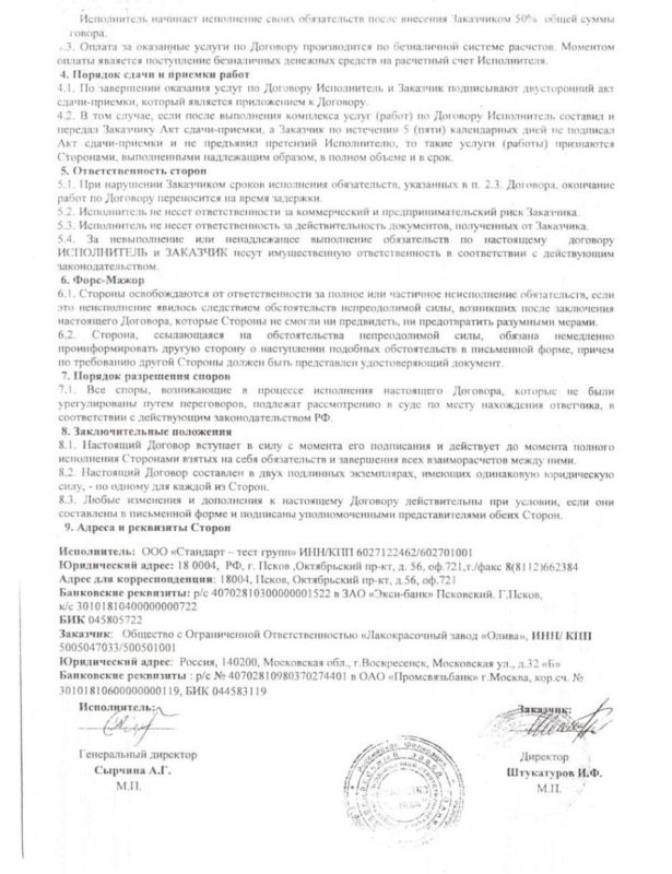 1. Странным является уже предмет договора (п.1.1.2): договор заключен не на проведение испытаний, а только на получение протокола испытаний! Предположение, что так написано потому, что заказчика интересует именно протокол, не выдерживает, как нам кажется, критики. Посудите сами. Они подписывают договор и оплачивают счет (не ранее 26 мая 2010 года) и получают "протокол" (сделанный не позднее 8 июня). Таким образом, на все-про-все - не более 8 + 5 = 13 дней. Но компания О., специалисты в лакокраске, не могли не знать, что проверка паропроницаемости длится не несколько дней, а несколько недель!
